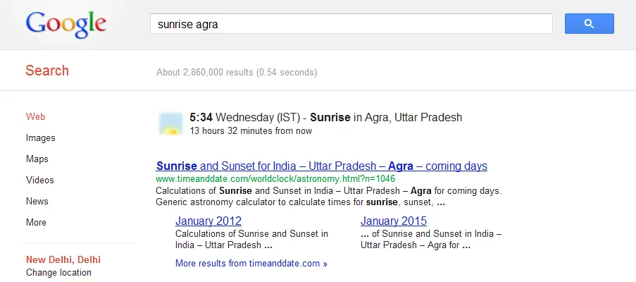 For instance, a query like sunrise Delhi will show you an approximate time when the sun will appear next in the Indian capital while sunset London will display the time when the sun is likely to disappear from London - all times are mentioned in the local time zone.